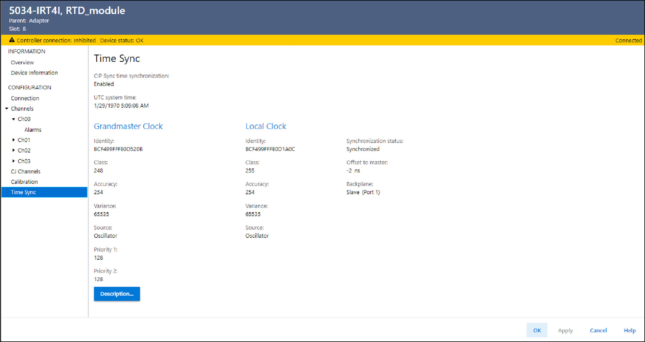 In der Ansicht „Time Sync“ (Zeitsynchronisierung) werden CIP Sync-Statusinformationen zum Modul angezeigt, wenn das Projekt online ist. Die Kategorie „Time Sync“ (Zeitsynchronisierung) zeigt die folgenden Informationen an: