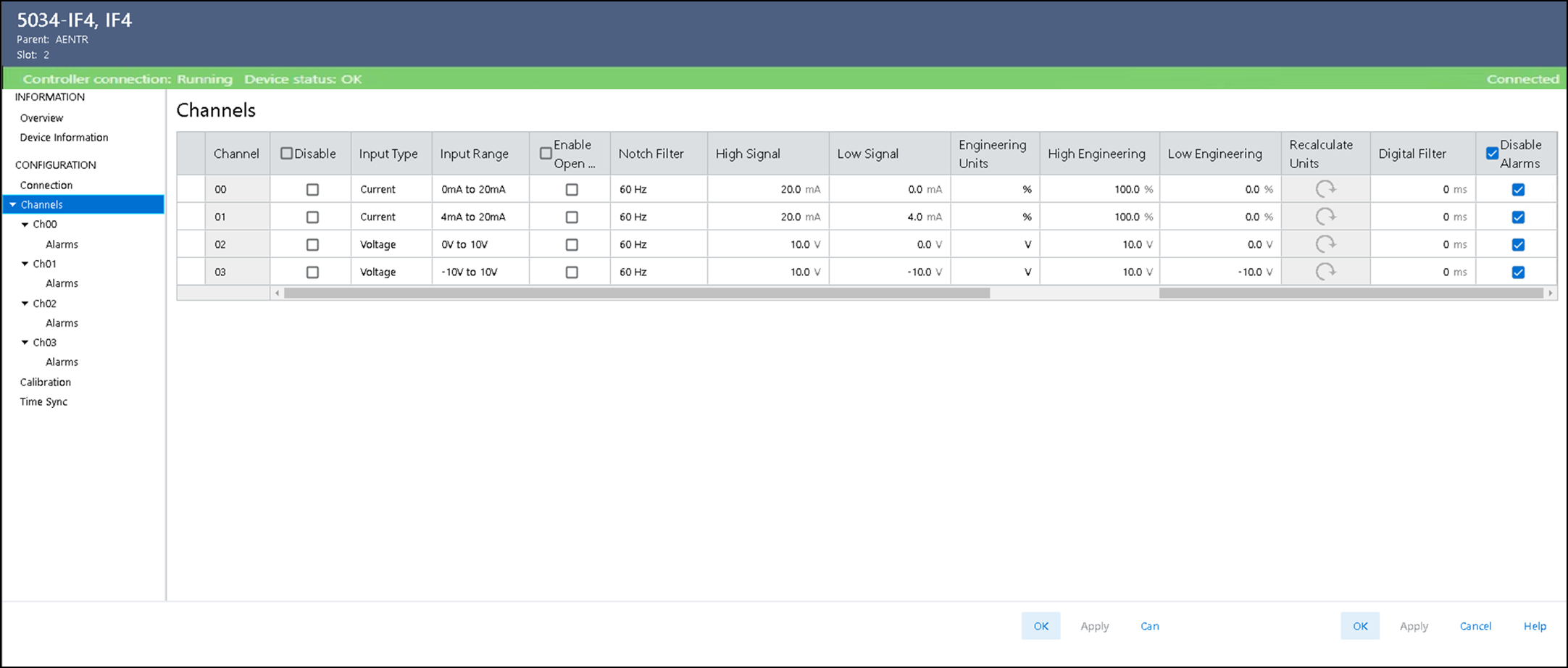 Zeigt die Kanaldiagnoseinformationen an, wenn eine Verbindung zum Modul besteht. Wenn Sie mit dem Modul online sind, wählen Sie in der Ansicht „Chxx“ die Schaltfläche „Diagnostics“ (Diagnose), um Diagnoseinformationen anzuzeigen.