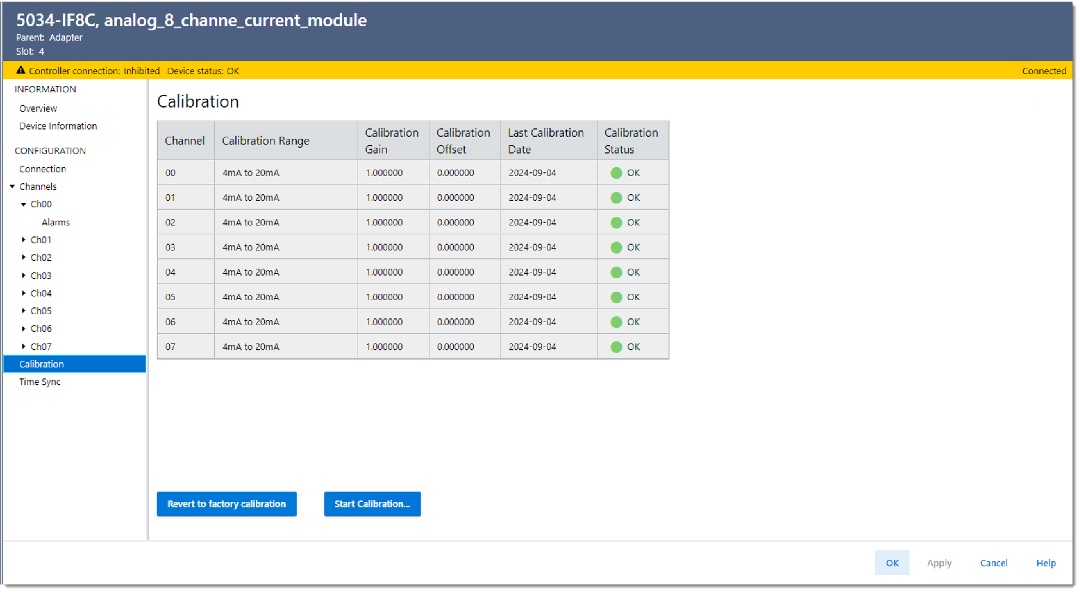 Die Ansicht „Calibration“ (Kalibrierung) stellt Kalibrierungsinformationen für alle Kanäle auf dem Modul bereit. Sie können für alle Kanäle folgende Aktionen in dieser Ansicht ausführen: