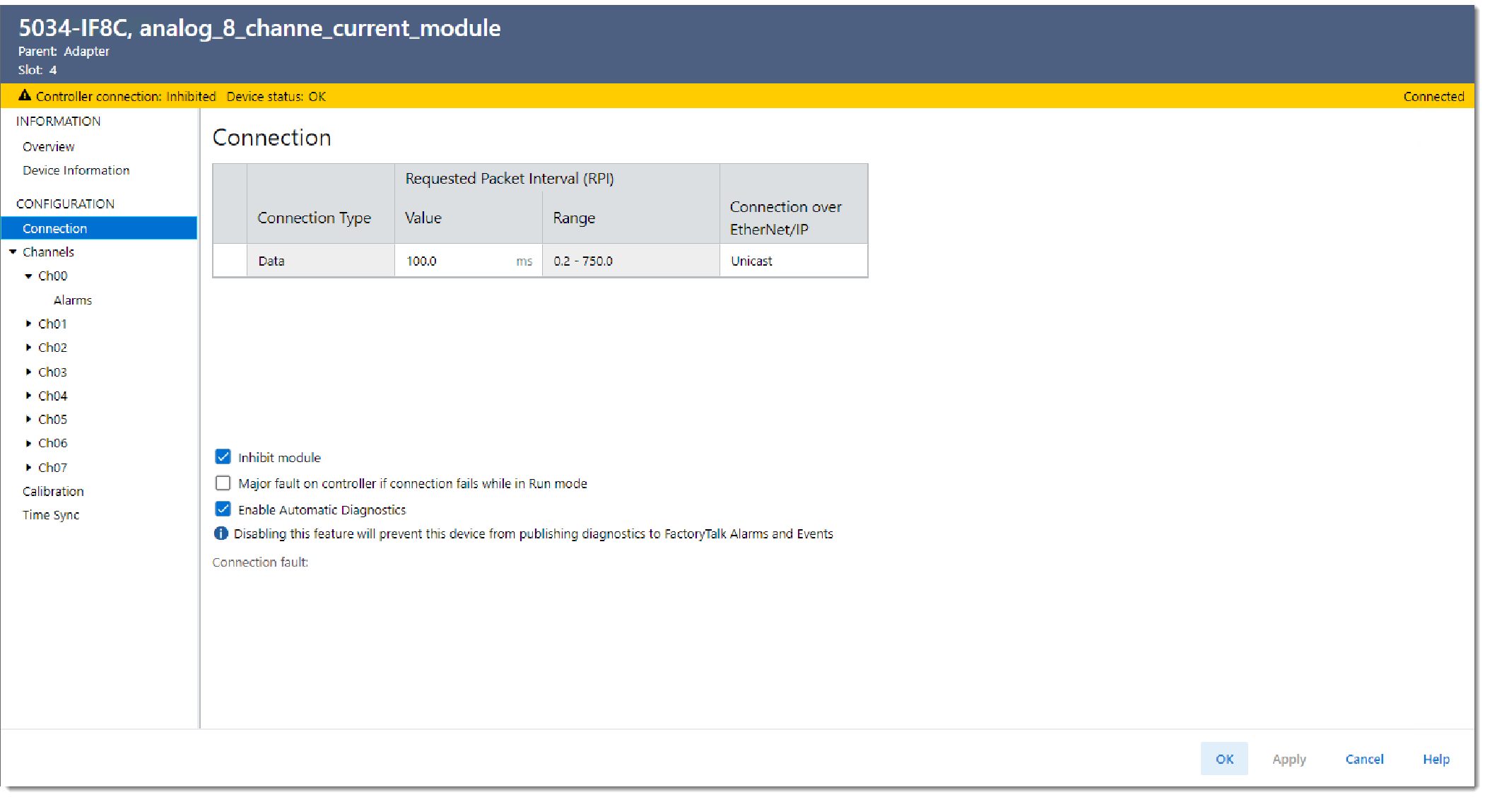 - Prüfen Sie die Ursache für den Verbindungsfehler.TIPP: Wenn ein Verbindungsfehler vorliegt, wird im Bereich „Connection Fault“ (Verbindungsfehler) der Fehlercode mit einer Beschreibung angezeigt, die Ihnen bei der Fehlerbehebung des Moduls hilft. Weitere Informationen finden Sie unter Fehlerbehebung bei Ihrem Modul.