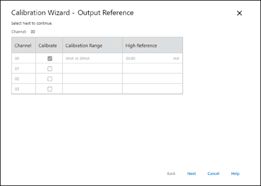 - Wenn das Dialogfeld „Output Reference“ (Ausgangsreferenz) mit dem zu kalibrierenden Kanal für die niedrige Referenz angezeigt wird, klicken Sie auf „Next“ (Weiter).