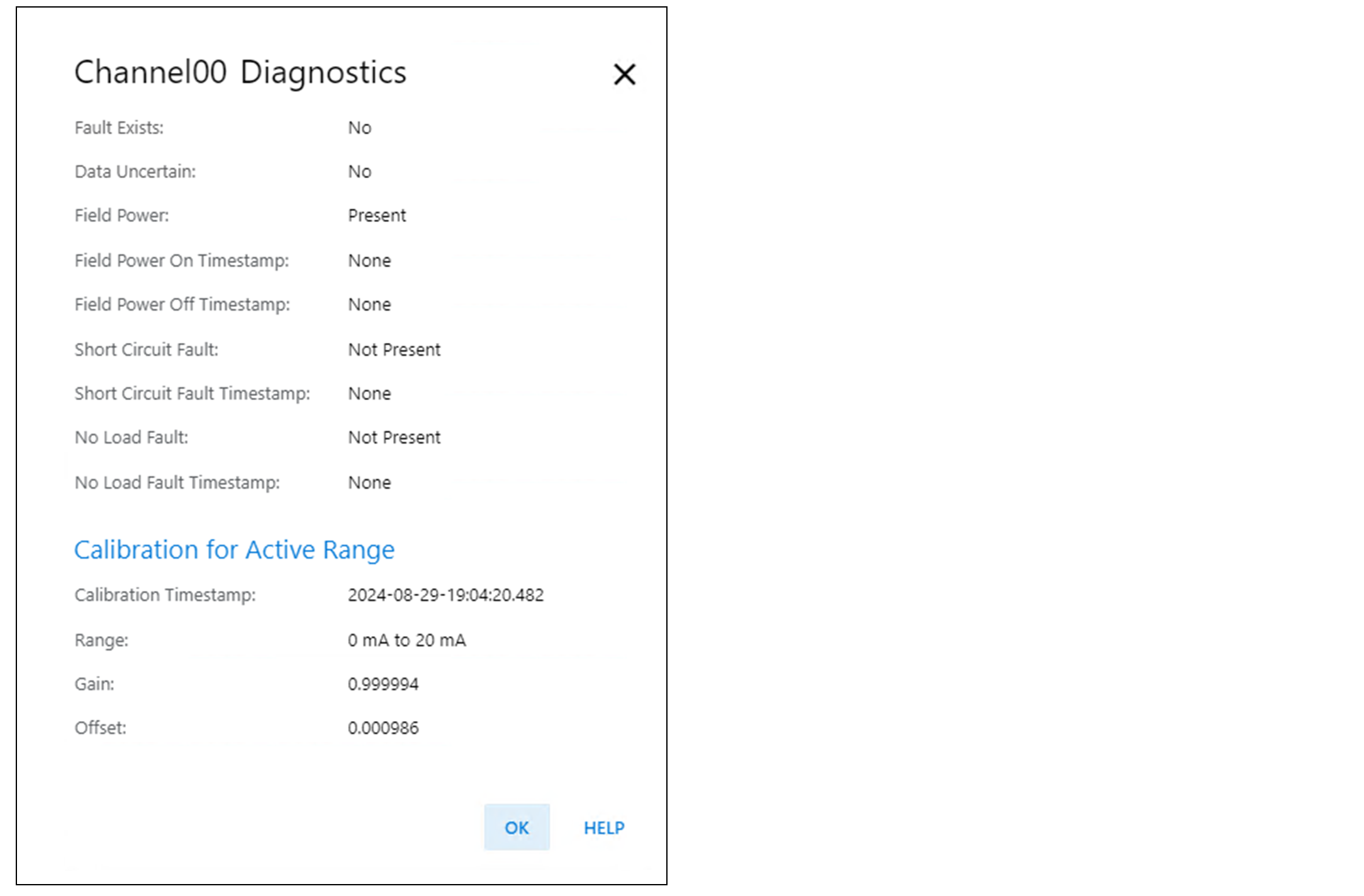 Zeigt die Kanaldiagnoseinformationen an, wenn eine Verbindung zum Modul besteht. Wenn Sie mit dem Modul online sind, wählen Sie in der Ansicht „Chxx“ die Schaltfläche „Diagnostics“ (Diagnose), um Diagnoseinformationen anzuzeigen.