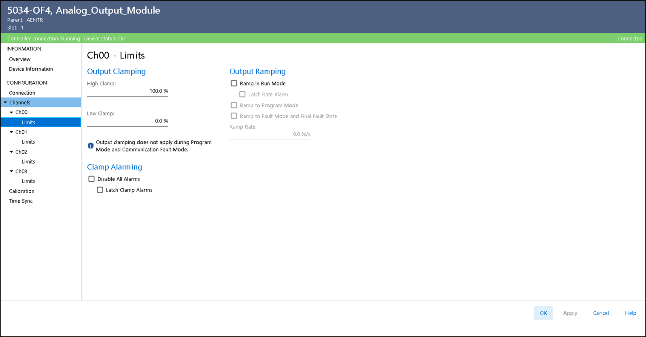 Jedem Kanal auf dem Analog-Ausgangsmodul ist eine Ansicht für Grenzwerte zugeordnet. Die Optionen für die Signaleinheiten entsprechen dem Ausgangstyp und Bereich des Kanals.