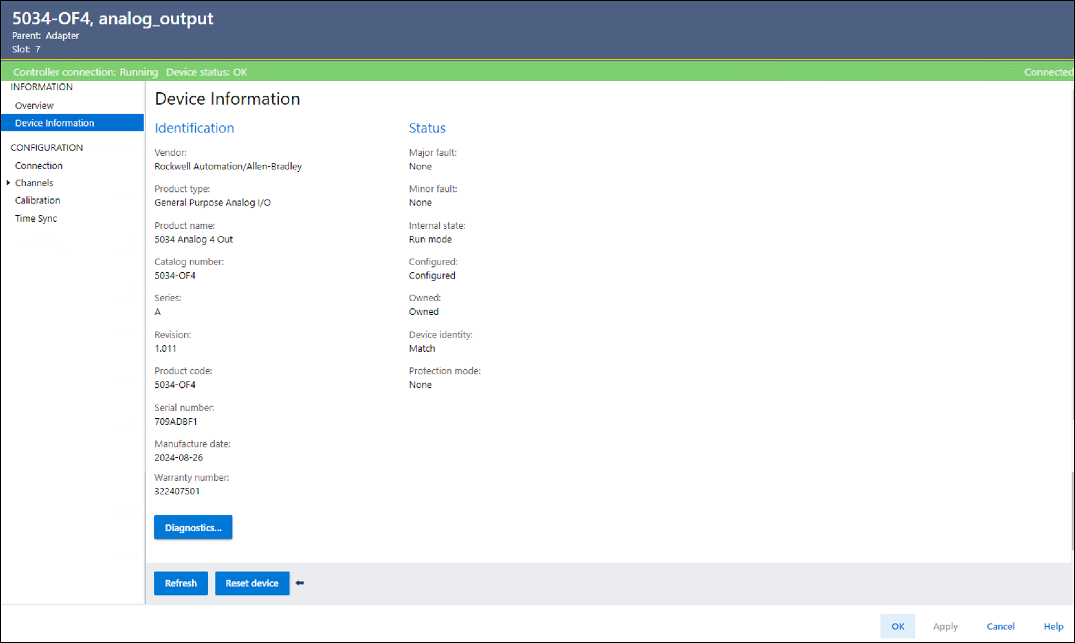 Verwenden Sie „Device Information“ (Geräteinformationen), um Geräte- und Statusinformationen anzuzeigen, wenn das Gerät online ist.