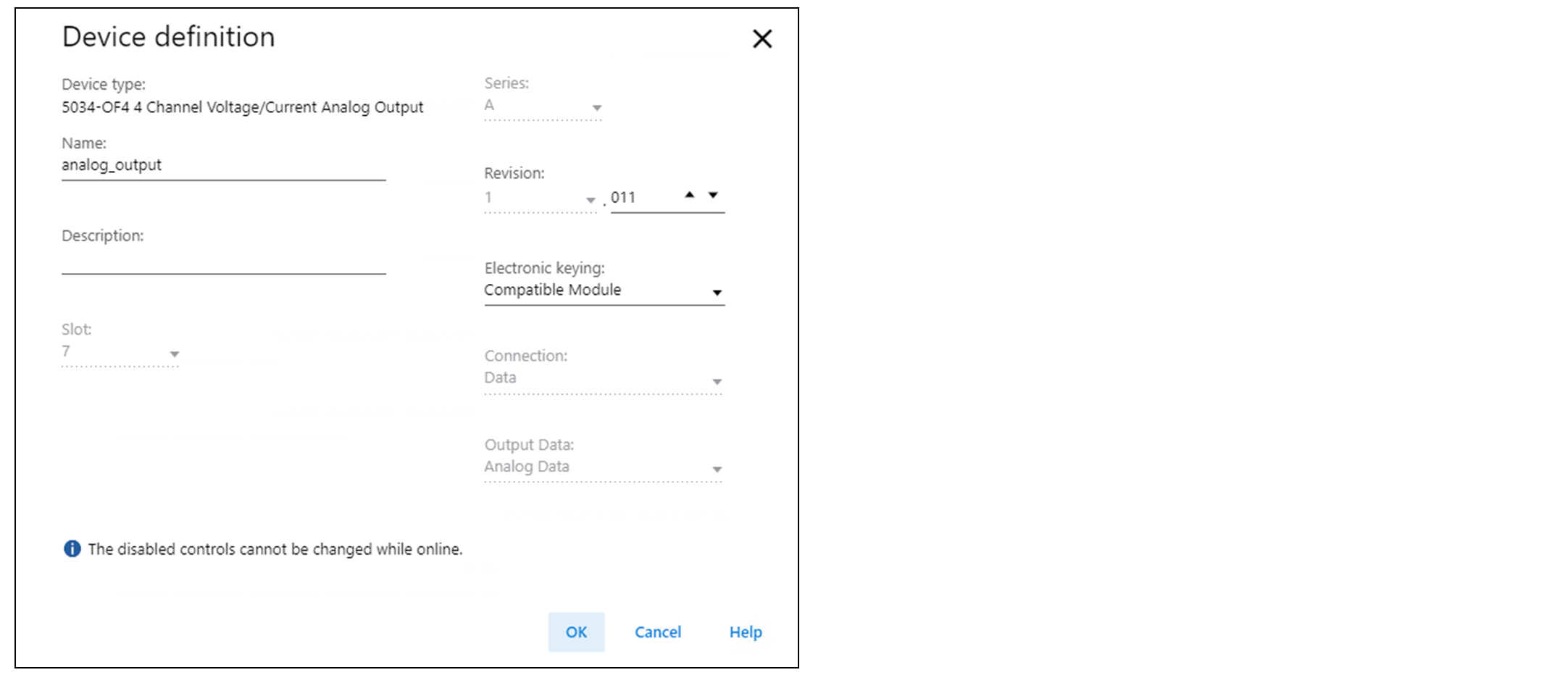 Slot (Steckplatz) | Geben Sie die Steckplatznummer des Geräts an. Je nach Plattform sind nur Steckplätze zwischen 1 und der maximalen Anzahl der E/A-Geräte gültig. Beim Erstellen des Geräts wird die Steckplatznummer standardmäßig auf die erste verfügbare Steckplatzposition gesetzt. Wenn die Steuerung in eine Steuerung geändert wird, die eine geringere maximale E/A-Anzahl unterstützt, ist der aktuelle Steckplatzwert möglicherweise nicht mehr gültig. | 1 bis 32 |