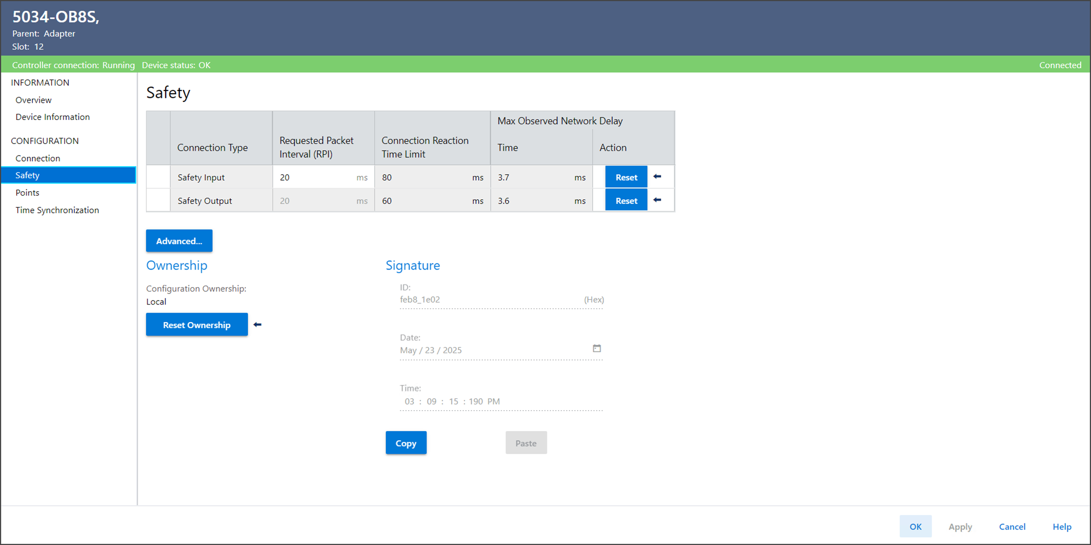 Um die Konfiguration für die Reaktionszeitgrenze der Verbindung zu ändern, klicken Sie in der Ansicht „Safety“ (Sicherheit) auf „Advanced“ (Erweitert). Weitere Informationen finden Sie unter Reaktionszeitgrenze der Verbindung mit Sicherheitsmodulen.