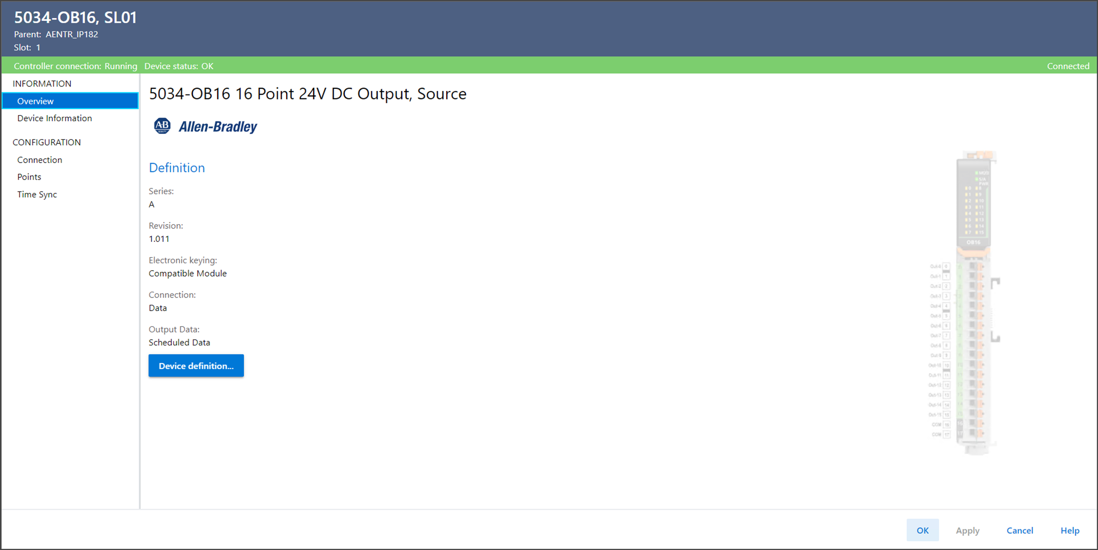 In der Übersicht können Sie die Definition eines Geräts anzeigen, einschließlich Gerätetyp, Version, elektronischer Codierung, Verbindung und anderer gerätespezifischer Werte.