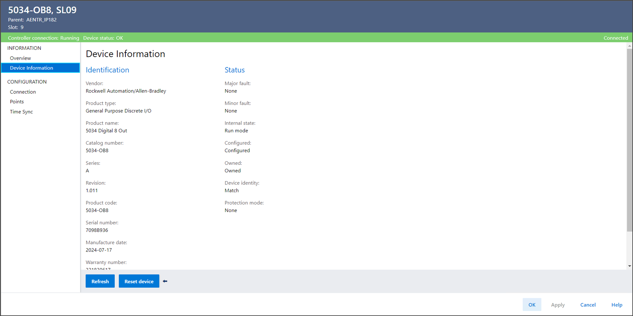 Nutzen Sie die Ansicht „Device Information“ (Geräteinformationen), um Geräte- und Statusinformationen anzuzeigen, wenn das Gerät online ist.