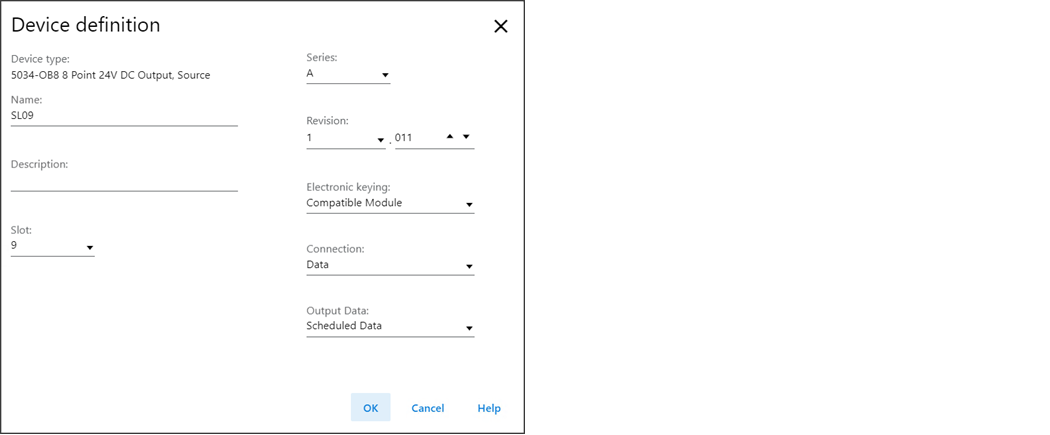 Slot (Steckplatz) | Geben Sie die Steckplatznummer des Geräts an. Je nach Plattform sind nur Steckplätze zwischen 1 und der maximalen Anzahl der E/A-Geräte gültig. Beim Erstellen des Geräts wird die Steckplatznummer standardmäßig auf die erste verfügbare Steckplatzposition gesetzt. Wenn die Steuerung in eine Steuerung geändert wird, die eine geringere maximale E/A-Anzahl unterstützt, ist der aktuelle Steckplatzwert möglicherweise nicht mehr gültig. | 1 bis 32 |