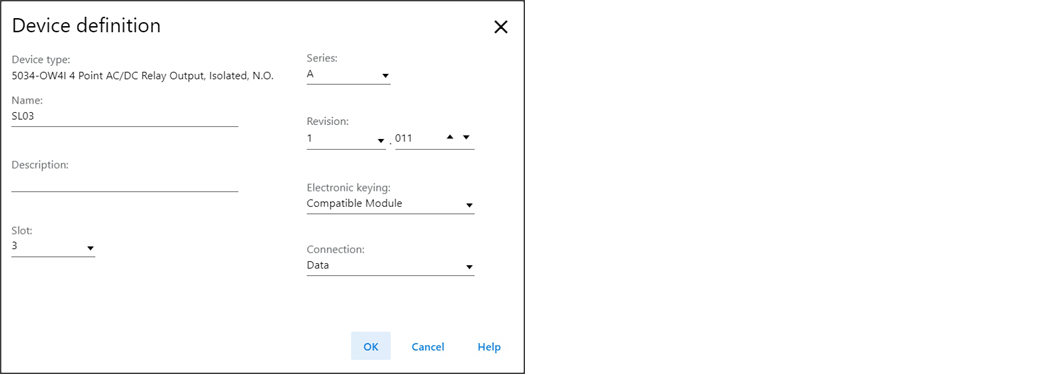 Slot (Steckplatz) | Geben Sie die Steckplatznummer des Geräts an. Je nach Plattform sind nur Steckplätze zwischen 1 und der maximalen Anzahl der E/A-Geräte gültig. Beim Erstellen des Geräts wird die Steckplatznummer standardmäßig auf die erste verfügbare Steckplatzposition gesetzt. Wenn die Steuerung in eine Steuerung geändert wird, die eine geringere maximale E/A-Anzahl unterstützt, ist der aktuelle Steckplatzwert möglicherweise nicht mehr gültig. | 1 bis 32 |