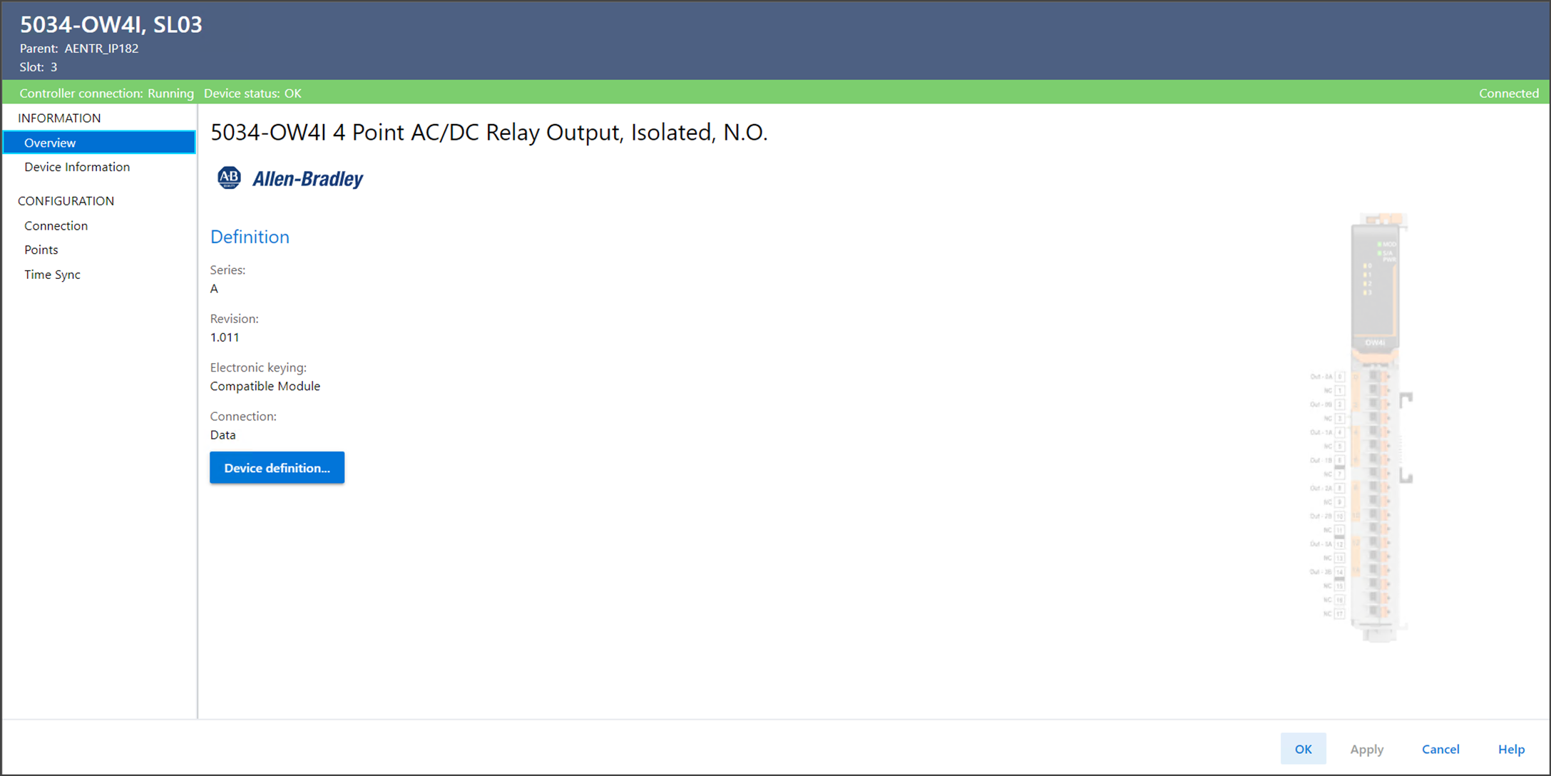 Connection (Verbindung) | Geben Sie die Art der Daten an, die zwischen dem Gerät und der Steuerung übertragen werden. Bei Auswahl von „Listen Only Data“ (Listen-Only-Daten) stellen die Steuerung und das Gerät die Kommunikation her, ohne dass die Steuerung Konfigurations- oder Ausgangsdaten an das Gerät sendet. Eine vollständige Eingangsdatenverbindung wird hergestellt, hängt jedoch von der Verbindung zwischen der Steuerung mit Verwaltungsrechten und dem Gerät ab. |