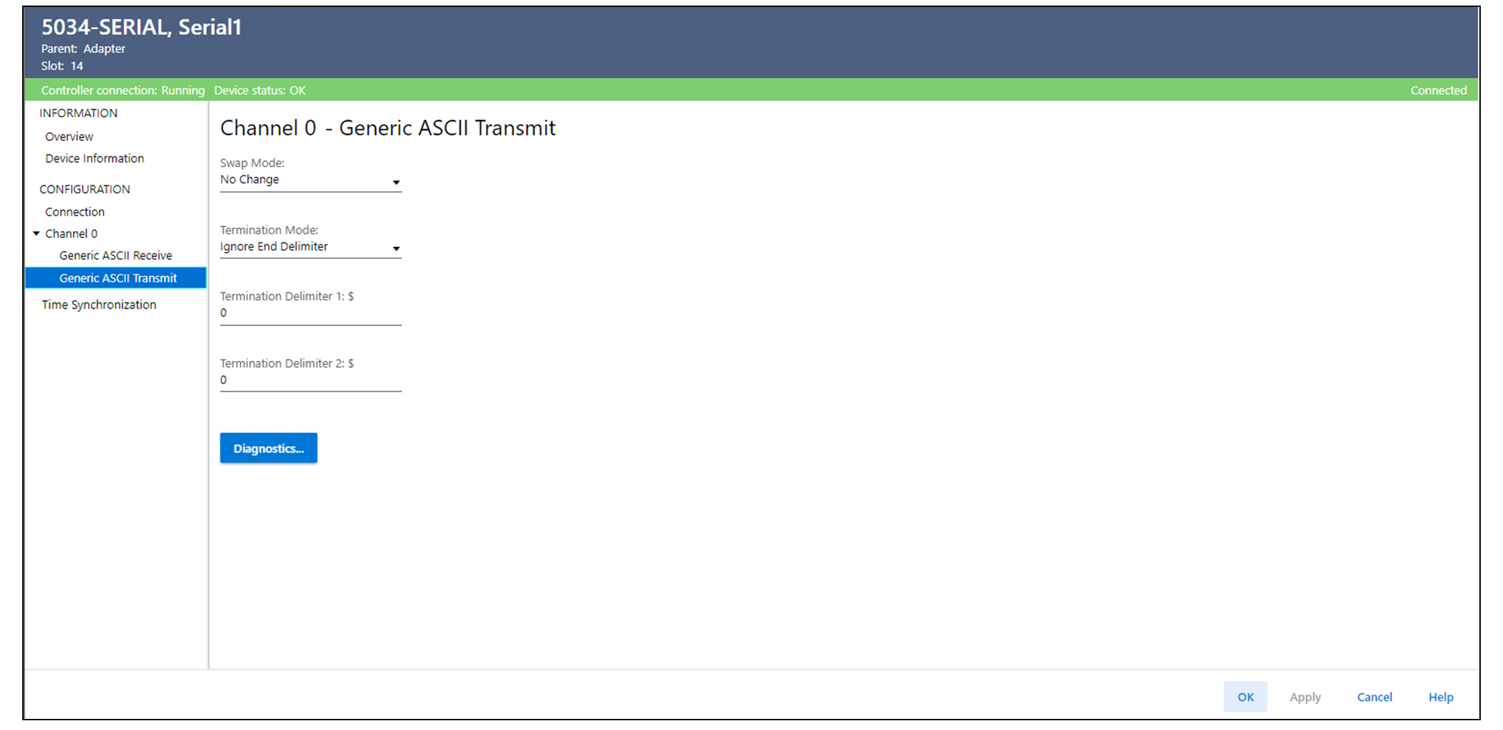 Wählen Sie „Diagnostics“ (Diagnose) aus, um die Diagnoseinformationen des generischen ASCII-Sende-/Empfangskanals anzuzeigen.