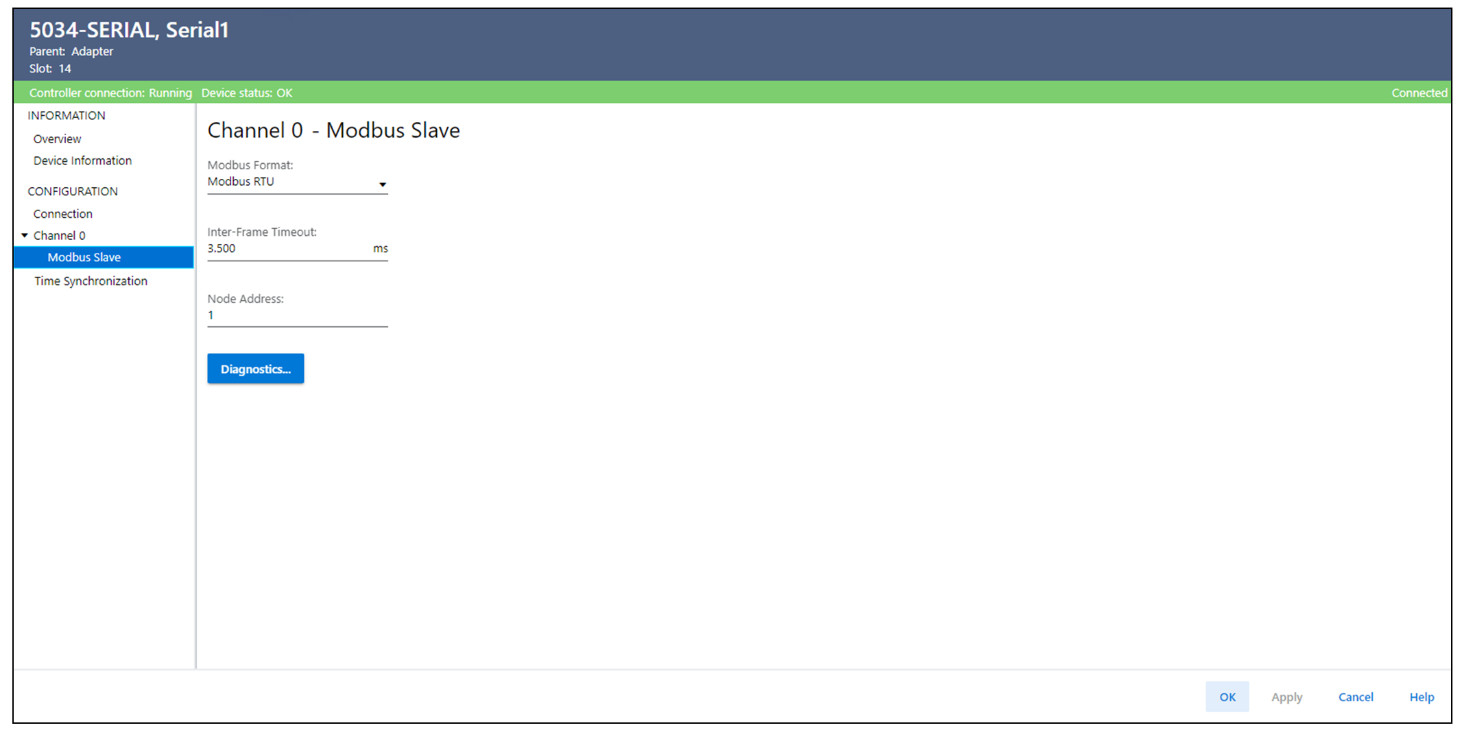 Wählen Sie „Diagnostics“ (Diagnose) aus, um die Diagnoseinformationen des Modbus-Slave-Kanals anzuzeigen.