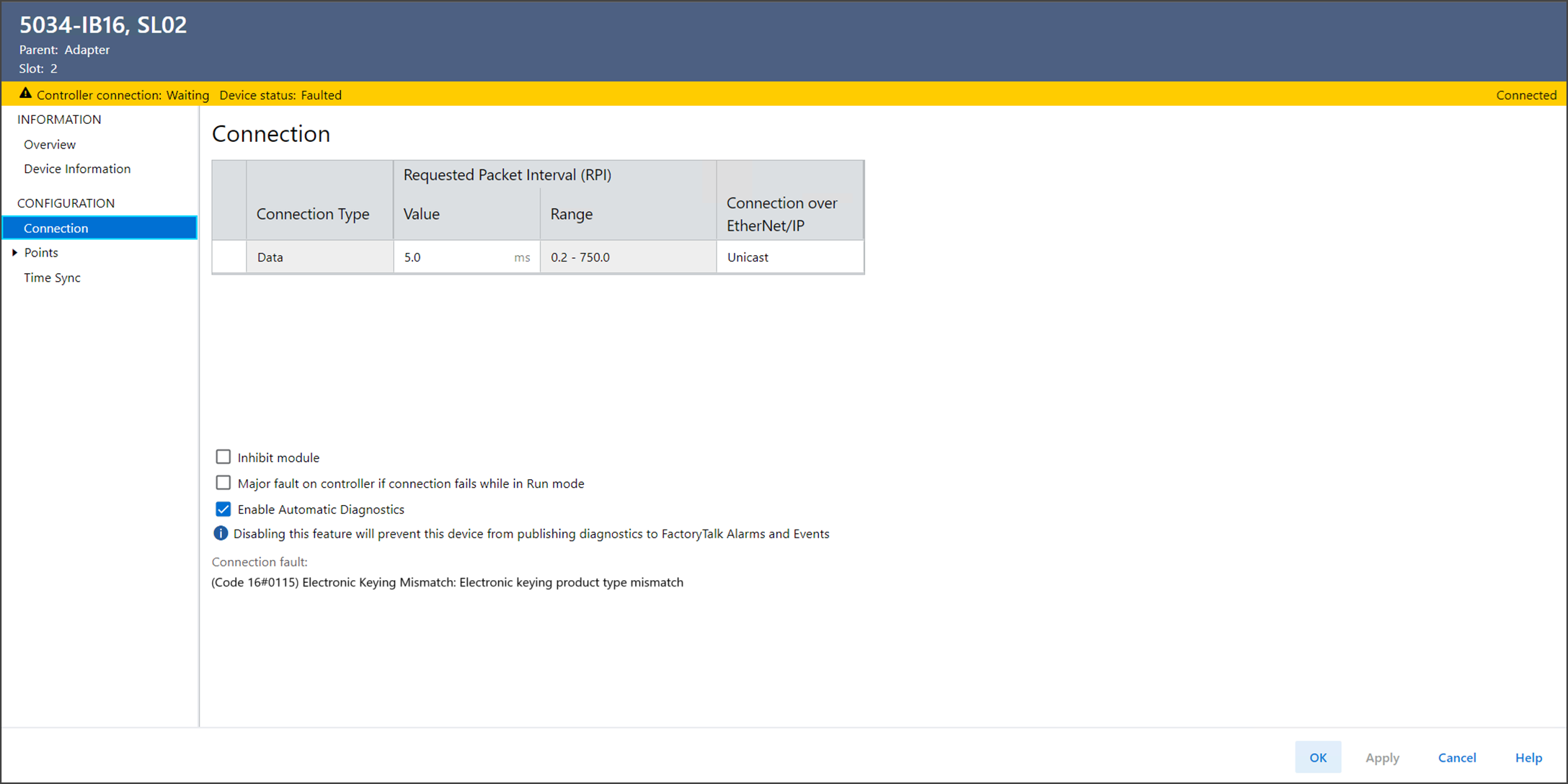 Überprüfen Sie im Steuerungsorganisator, ob ein Warnsymbol für das Modul angezeigt wird.