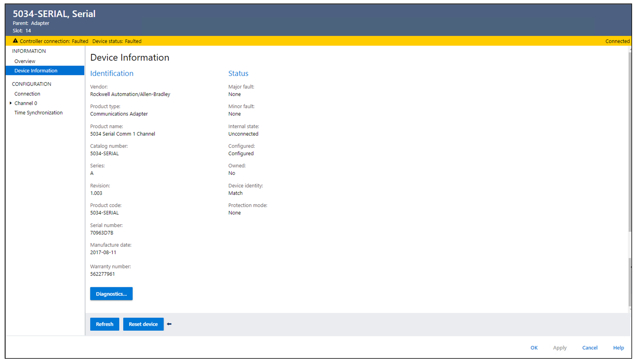Wenn ein Kanal fehlerhaft ist, navigieren Sie zur Ansicht „Channel 0 (Kanal 0) → Modbus Master, Modbus Slave oder Generic ASCII“ und wählen Sie „Diagnostics“ (Diagnose) aus, um die Diagnosebedingung des Kanals anzuzeigen.