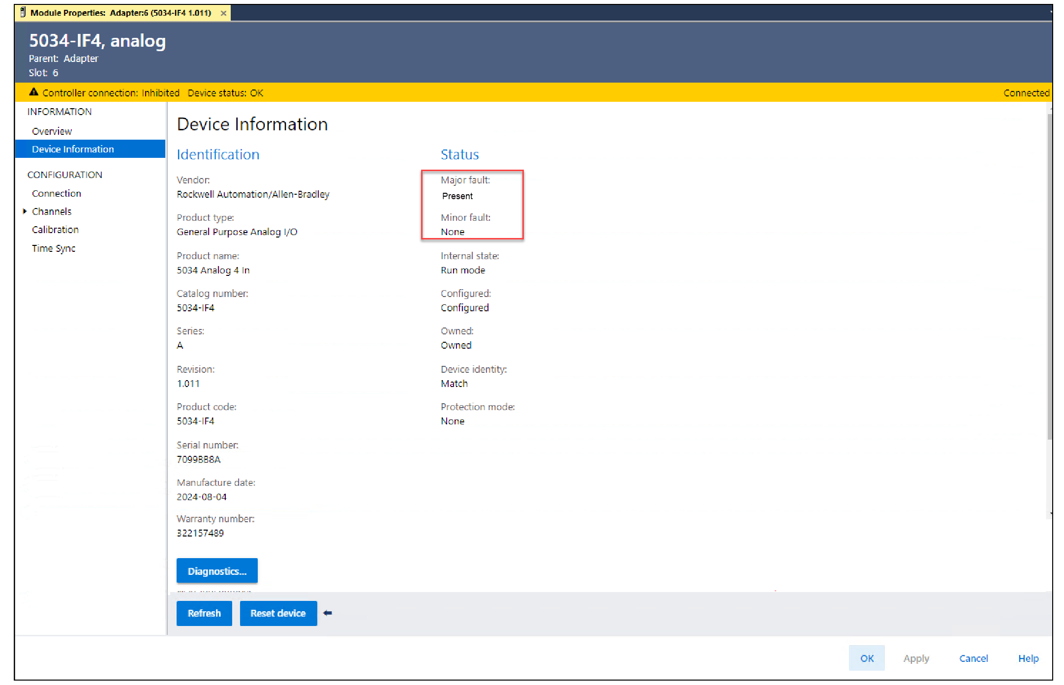 If a channel is faulted, go to the Channels → Chxx view and select the Diagnostics to