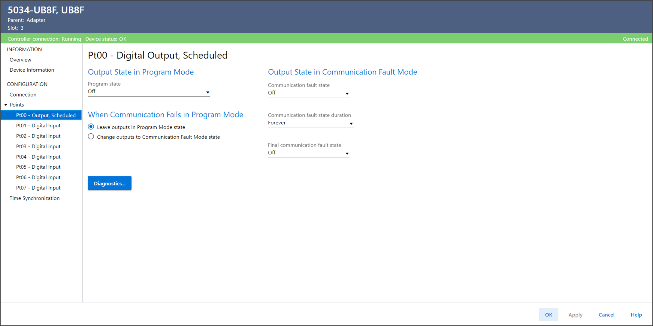 Output State in Communication Fault Mode Communication Fault State | Determines what happens to the output of each point after a