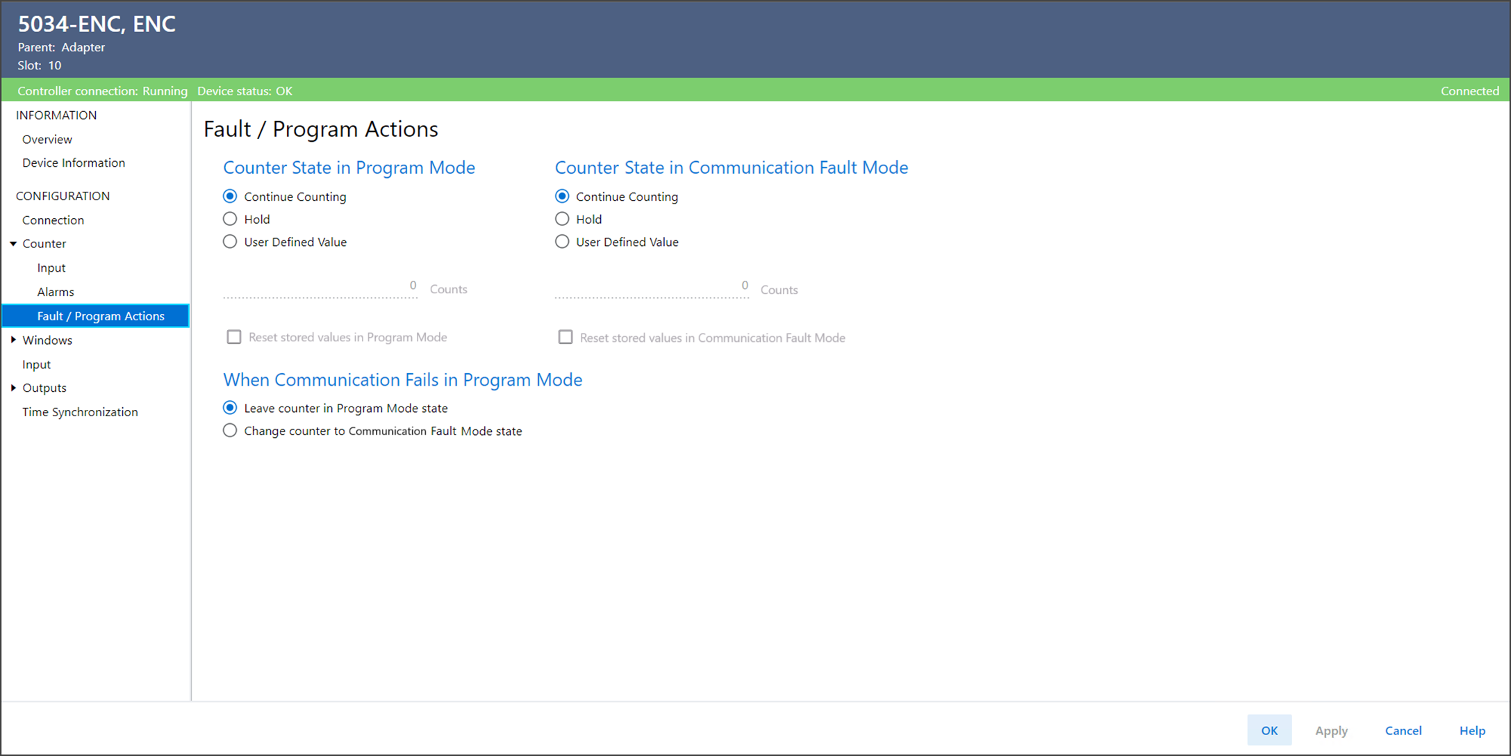 Counter State in Communication Fault Mode | Determines what happens to the counter after a communication
