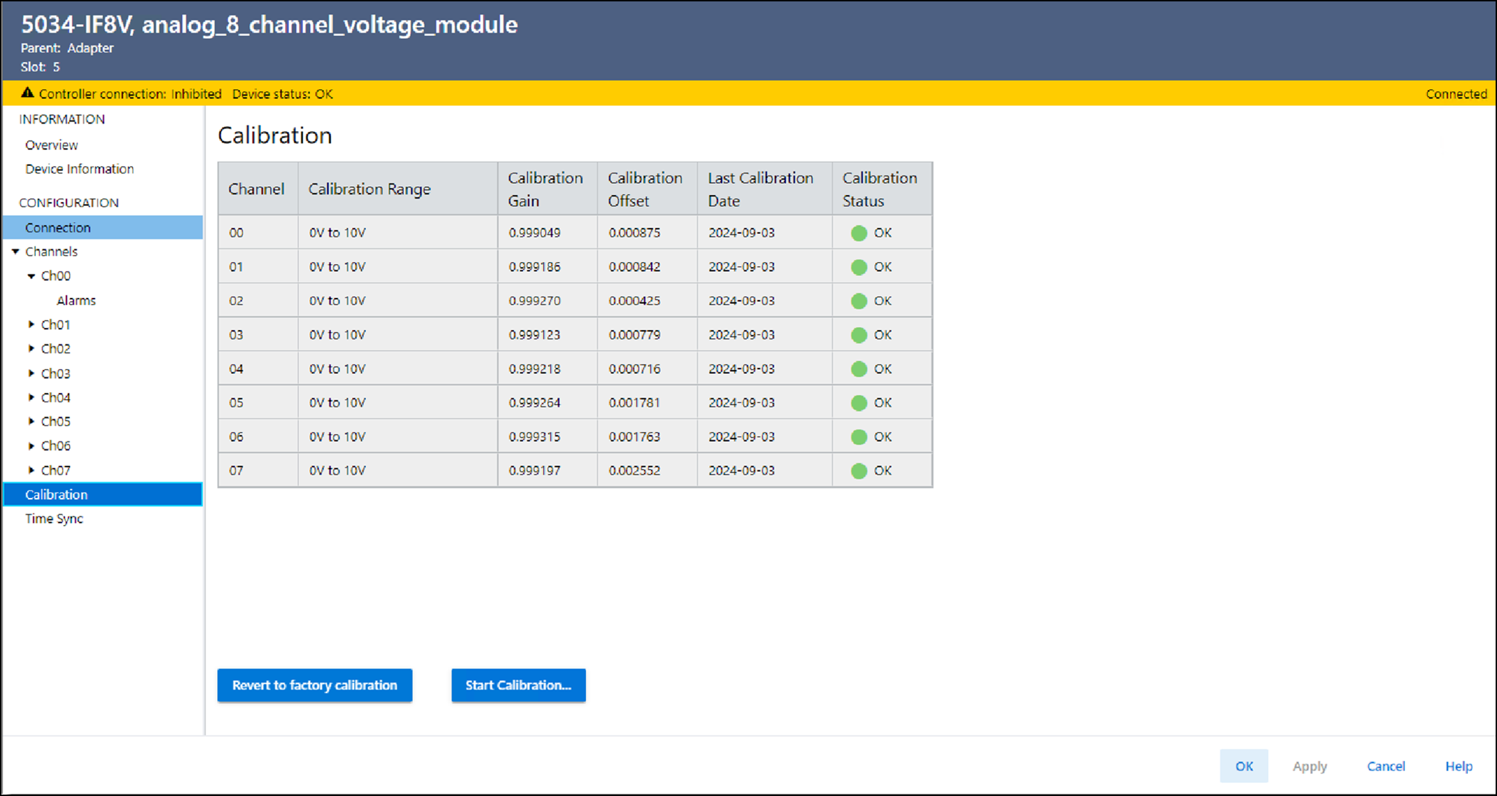 La vista Calibration presenta información de calibración sobre todos los canales del módulo. Puede realizar las siguientes acciones en esta vista para todos los canales: