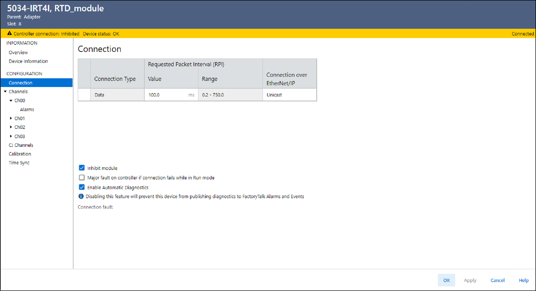 - Vea la causa del fallo de conexión.CONSEJO: Si hay un fallo de conexión, el área Connection Fault muestra el código de error con una descripción que le ayuda a resolver los problemas del módulo. Para obtener más información, consulte Resolución de problemas del módulo.