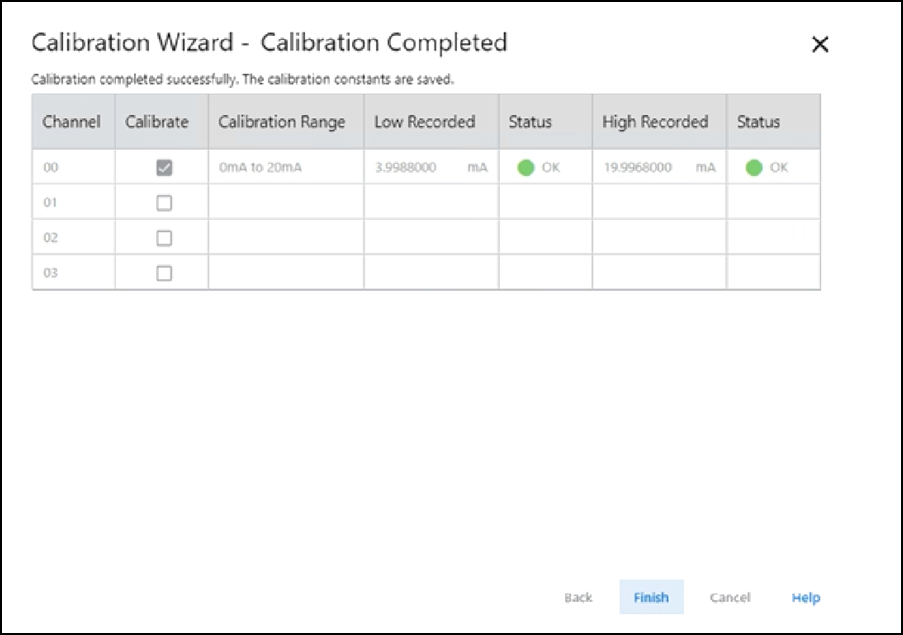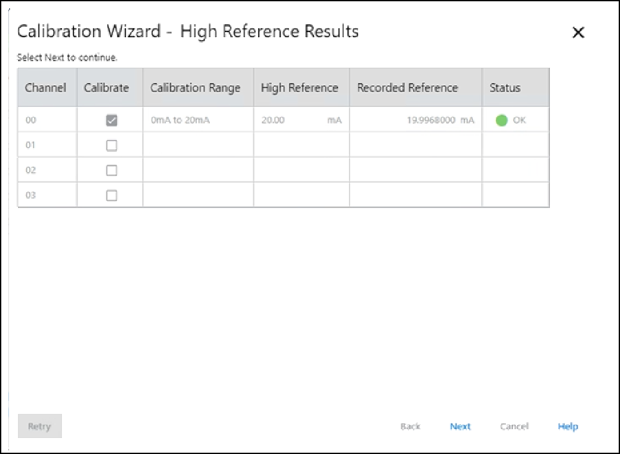 - Anote el valor medido en la columna Recorded Reference y seleccione Next.Aparece el cuadro de diálogo High Reference Results para indicar el estado del canal calibrado.