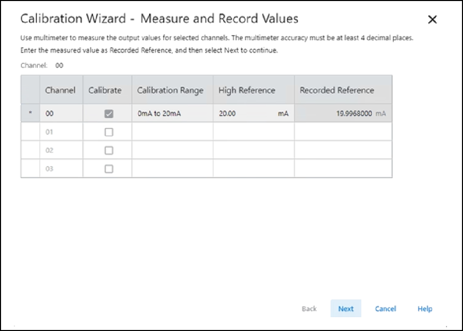 - Cuando aparezca el cuadro de diálogo Output Reference e indique el canal que hay que calibrar para la referencia alta, seleccione Next.
