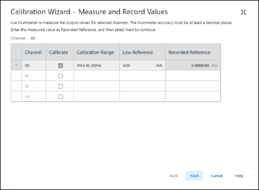 - Cuando aparezca el cuadro de diálogo Output Reference e indique el canal que hay que calibrar para la referencia baja, seleccione Next.