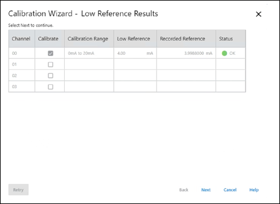 - Anote el valor medido en la columna Recorded Reference y seleccione Next.Aparece el cuadro de diálogo Low Reference Results para indicar el estado del canal calibrado.