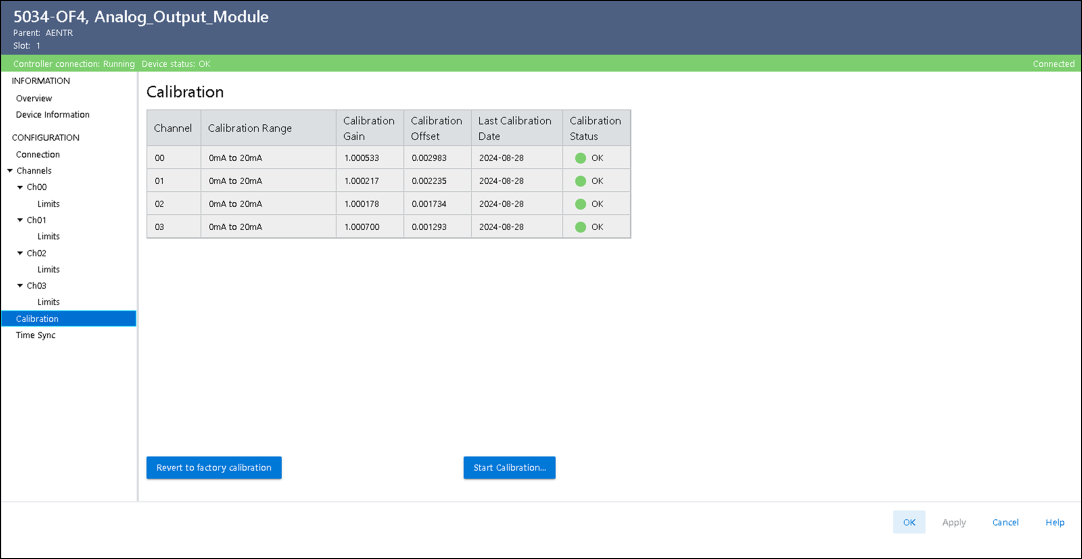 - En la vista Calibration del cuadro de diálogo Module Properties, seleccione Start Calibration.