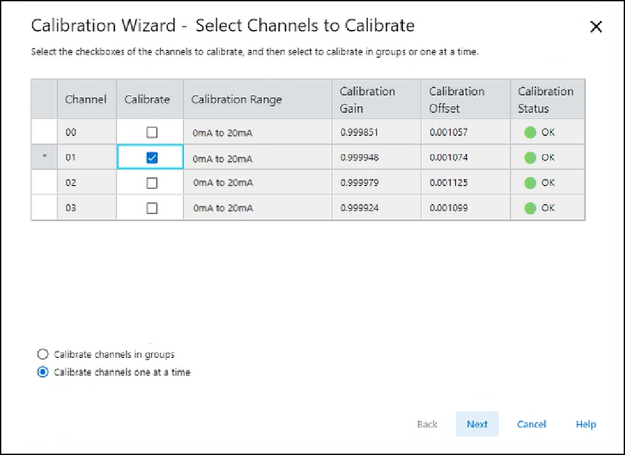 - Seleccione los canales uno por vez o en grupos para calibrarlos y seguidamente seleccione Next.