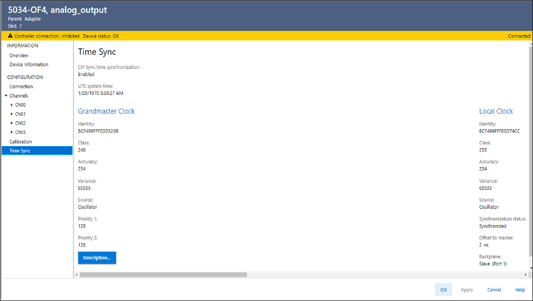 El cuadro de diálogo Grandmaster clock description proporciona información detallada acerca del reloj Grandmaster. Para ver la descripción del reloj Grandmaster, seleccione Description en la vista Time Sync.