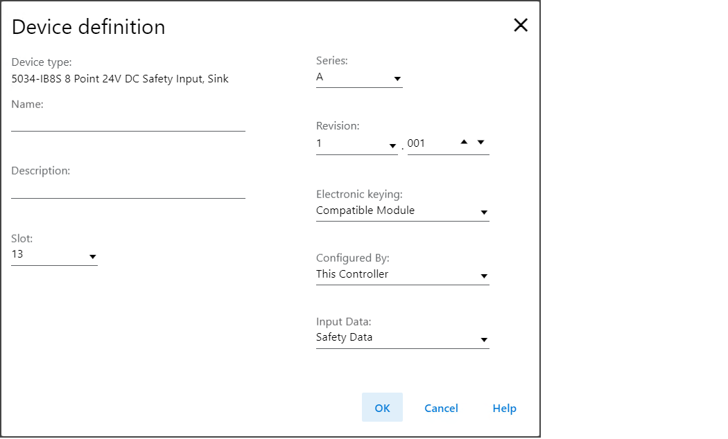 Name | Introduzca un nombre de dispositivo compatible con la norma IEC 61131. Si se introduce un carácter no válido en este campo o si el nombre tiene más de 40 caracteres, el software lo ignorará. | Todos los valores válidos |