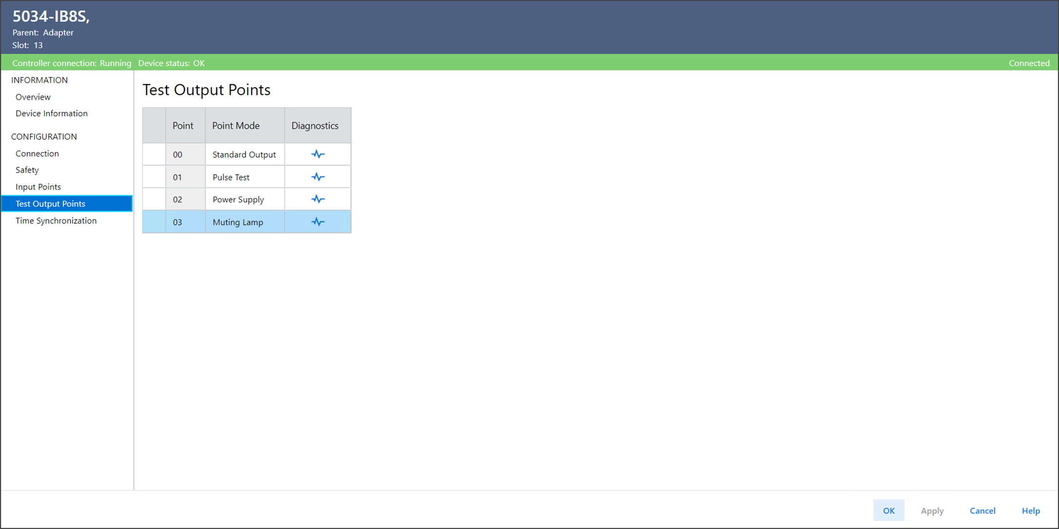 Para ver el diagnóstico de la salida de prueba Ptxx, seleccione Diagnostics en la vista Test Output Points.