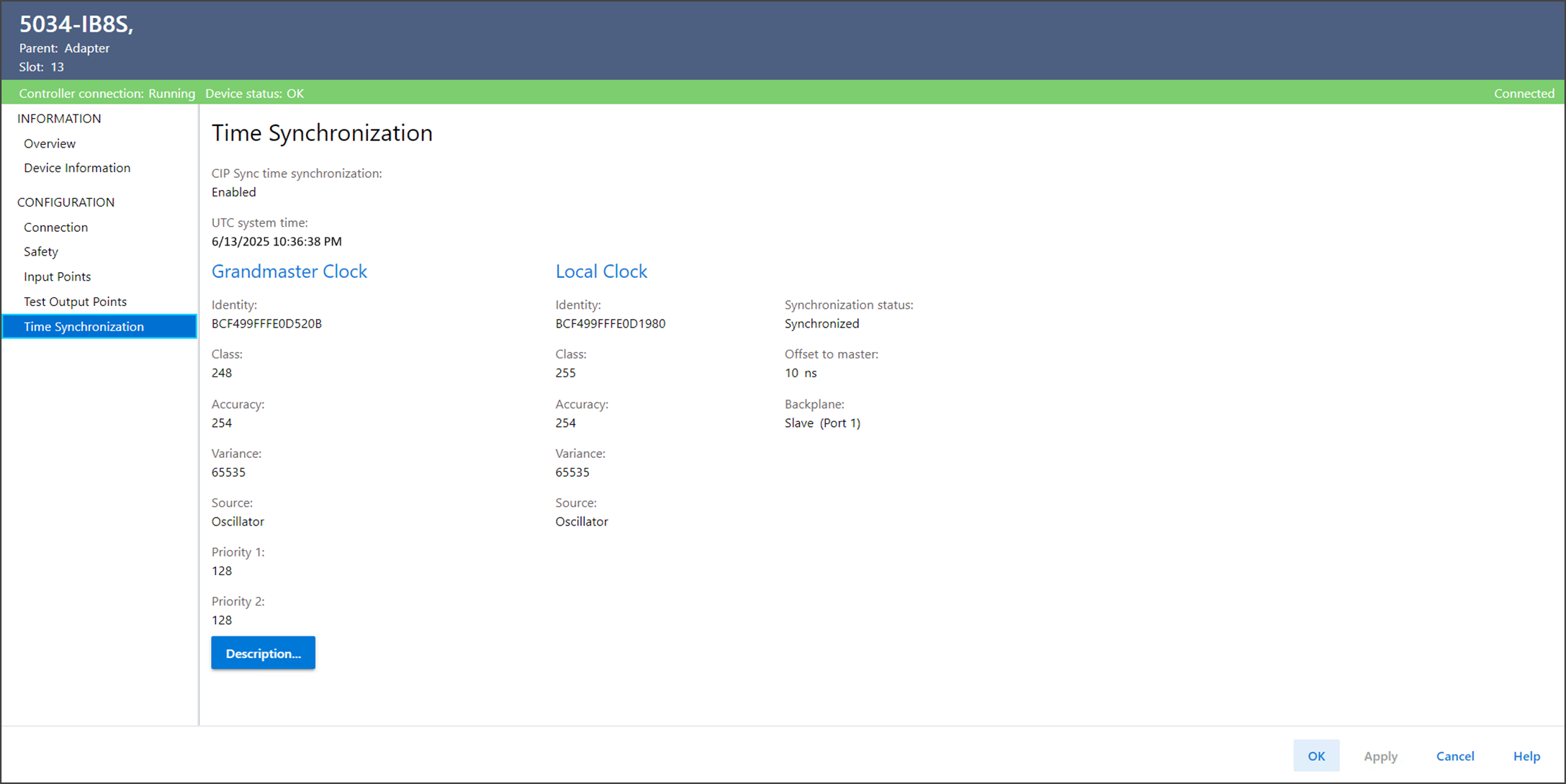 La vista Time Synchronization es de solo lectura y muestra la información de estado de
