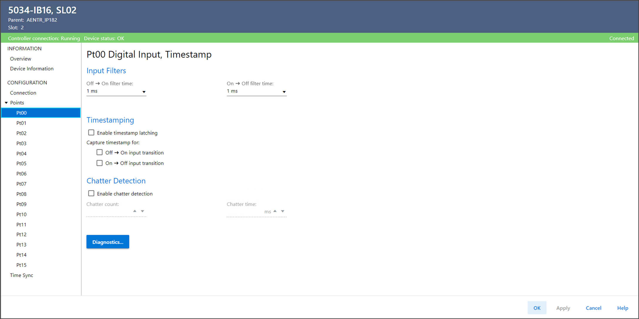 Para ver el diagnóstico de Ptxx, seleccione Diagnostics en las vistas Points o Ptxx.
