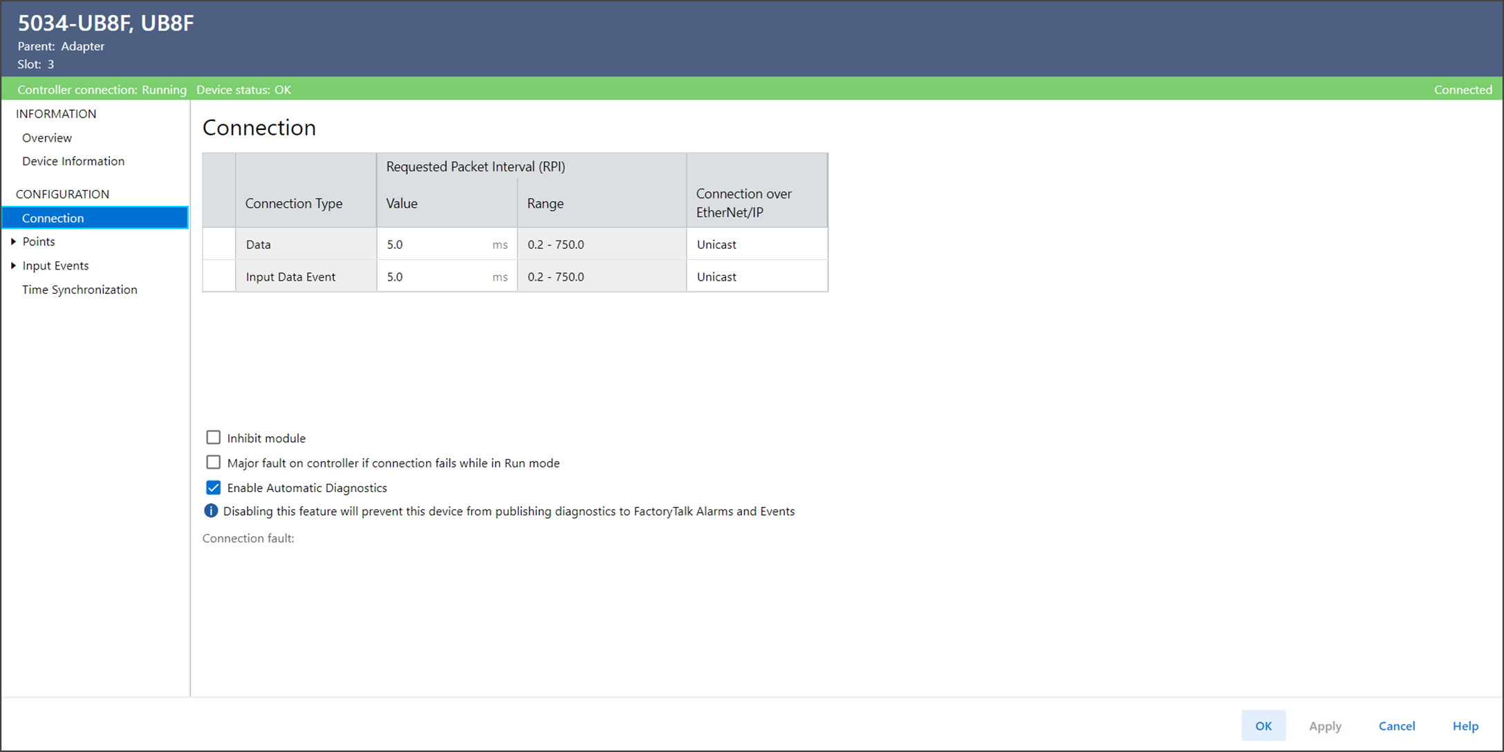 Si no habilita Automatic Diagnostics, el dispositivo no publicará diagnósticos en FactoryTalk Alarms and Events.