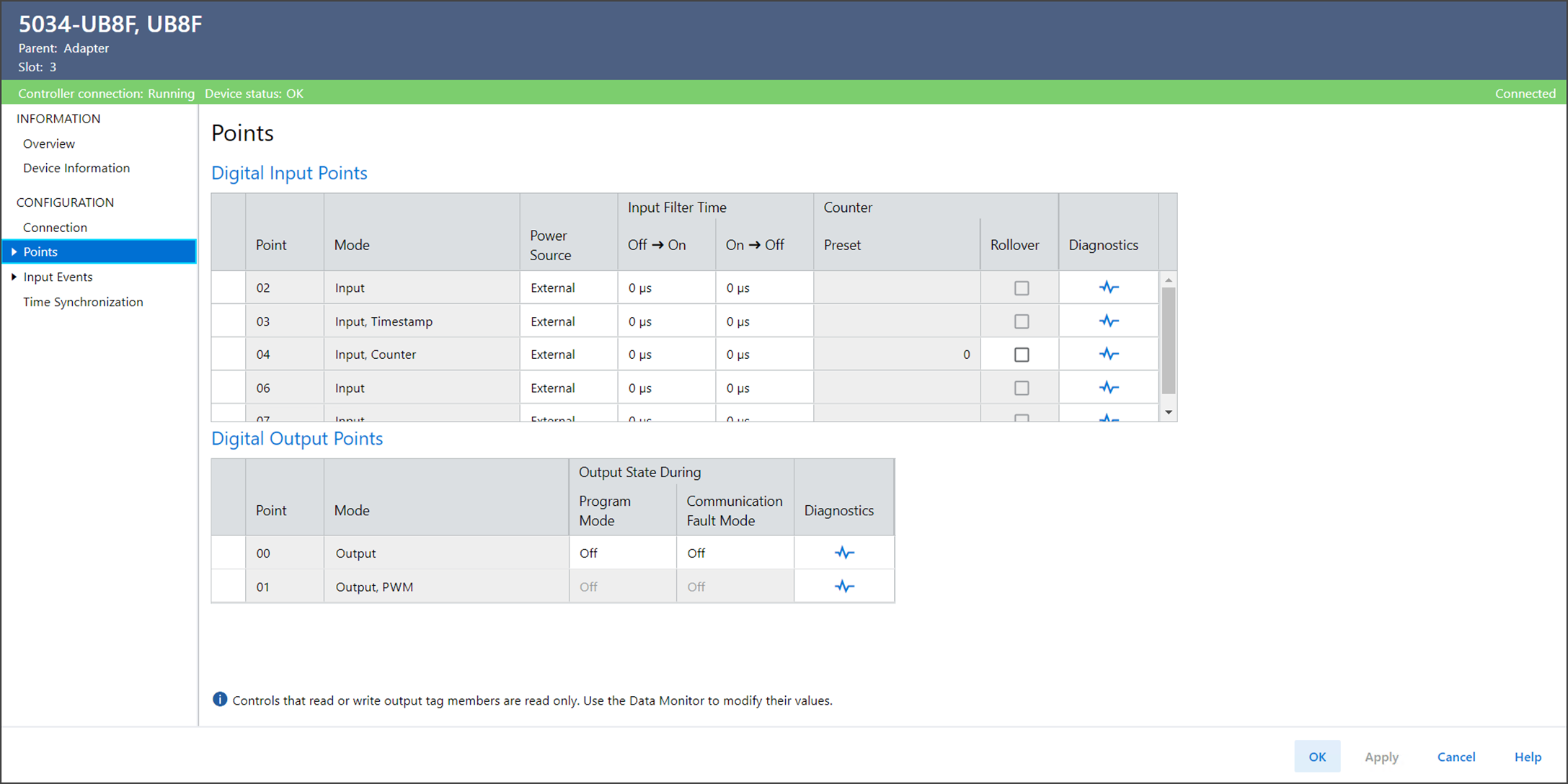 La vista Points incluye estos parámetros para los puntos de entradas digitales: