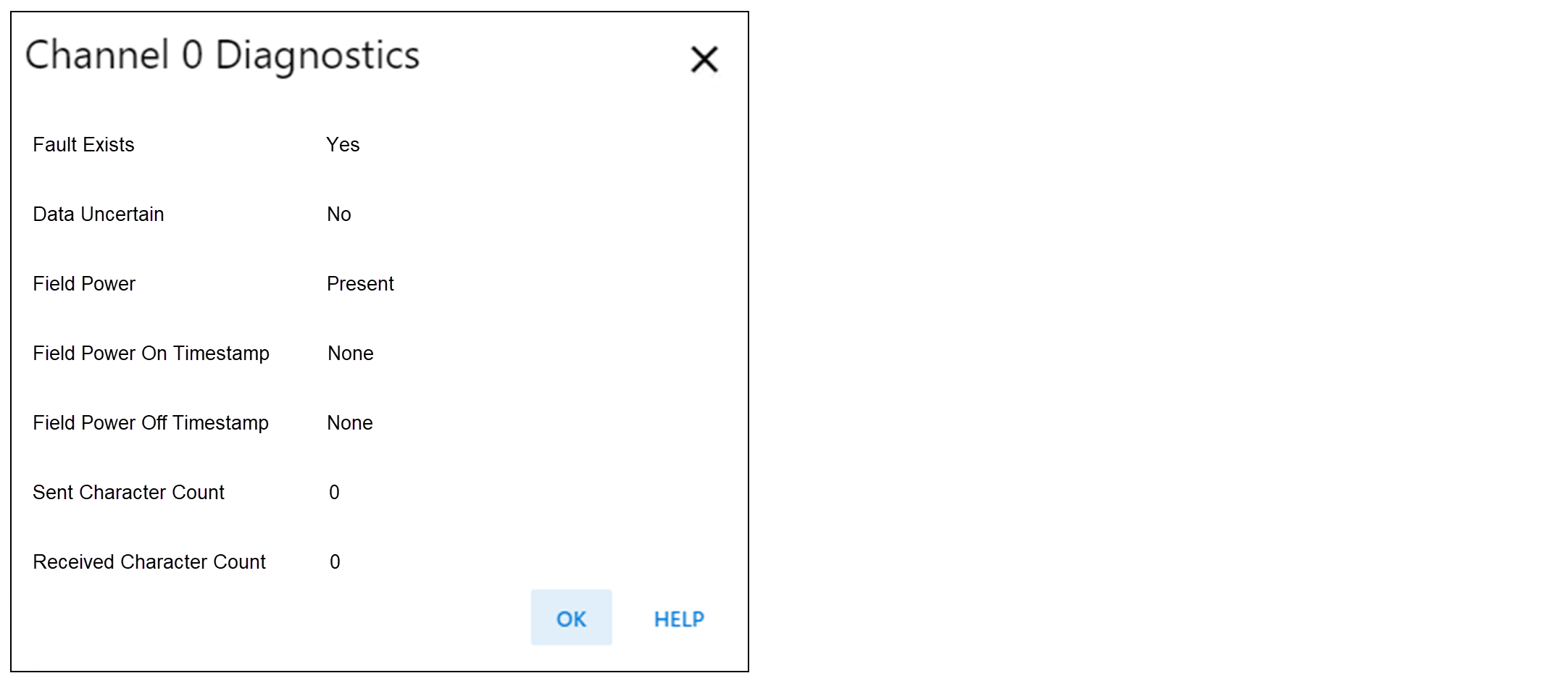 Si un canal presenta un fallo, vaya a Channel 0 → Modbus Master, Modbus Slave o Generic ASCII y seleccione Diagnostics para ver la condición de diagnóstico del canal.