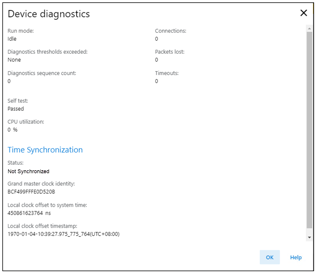 Si hay un fallo de sincronización de hora, vaya al cuadro de diálogo Device Diagnostics para comprobar el estado de sincronización de hora y la identidad del reloj Grandmaster.