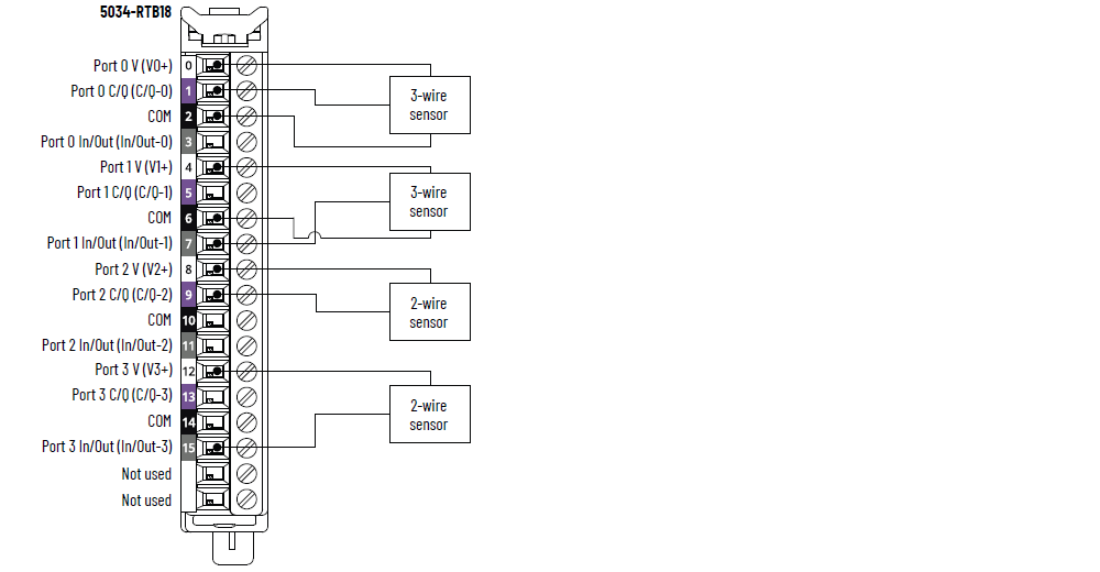 Reportez-vous aux caractéristiques de câblage pour les borniers débrochables dans la publication 5034-TD001, « Caractéristiques du système PointMax I/O Données techniques »