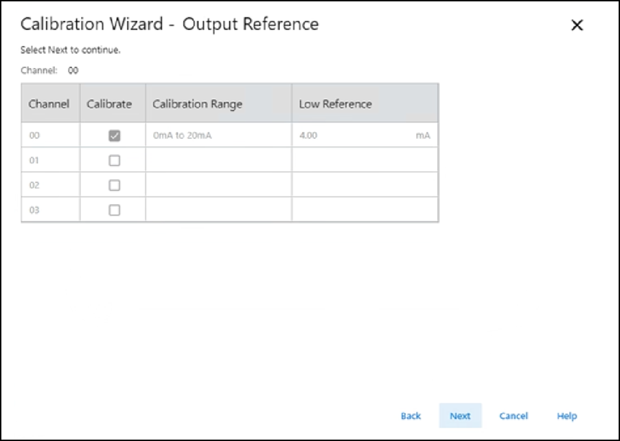 - Lorsque la boîte de dialogue Output Reference (Référence de sortie) apparaît et indique la voie à étalonner pour la référence basse, sélectionnez Next (Suivant).