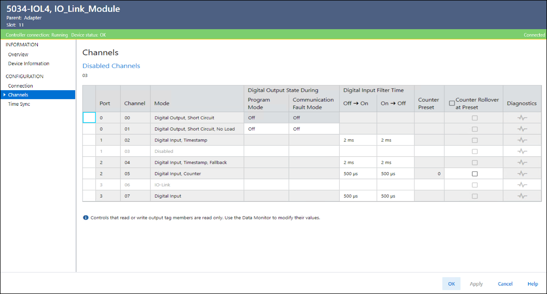 La page Channels (Voies) montre un aperçu des valeurs de configuration de toutes les voies du module. Les valeurs de chaque voie indiquent comment cette voie particulière est configurée sur cette page de voie. Vous pouvez modifier certains paramètres de configuration dans cette vue, mais pas tous.