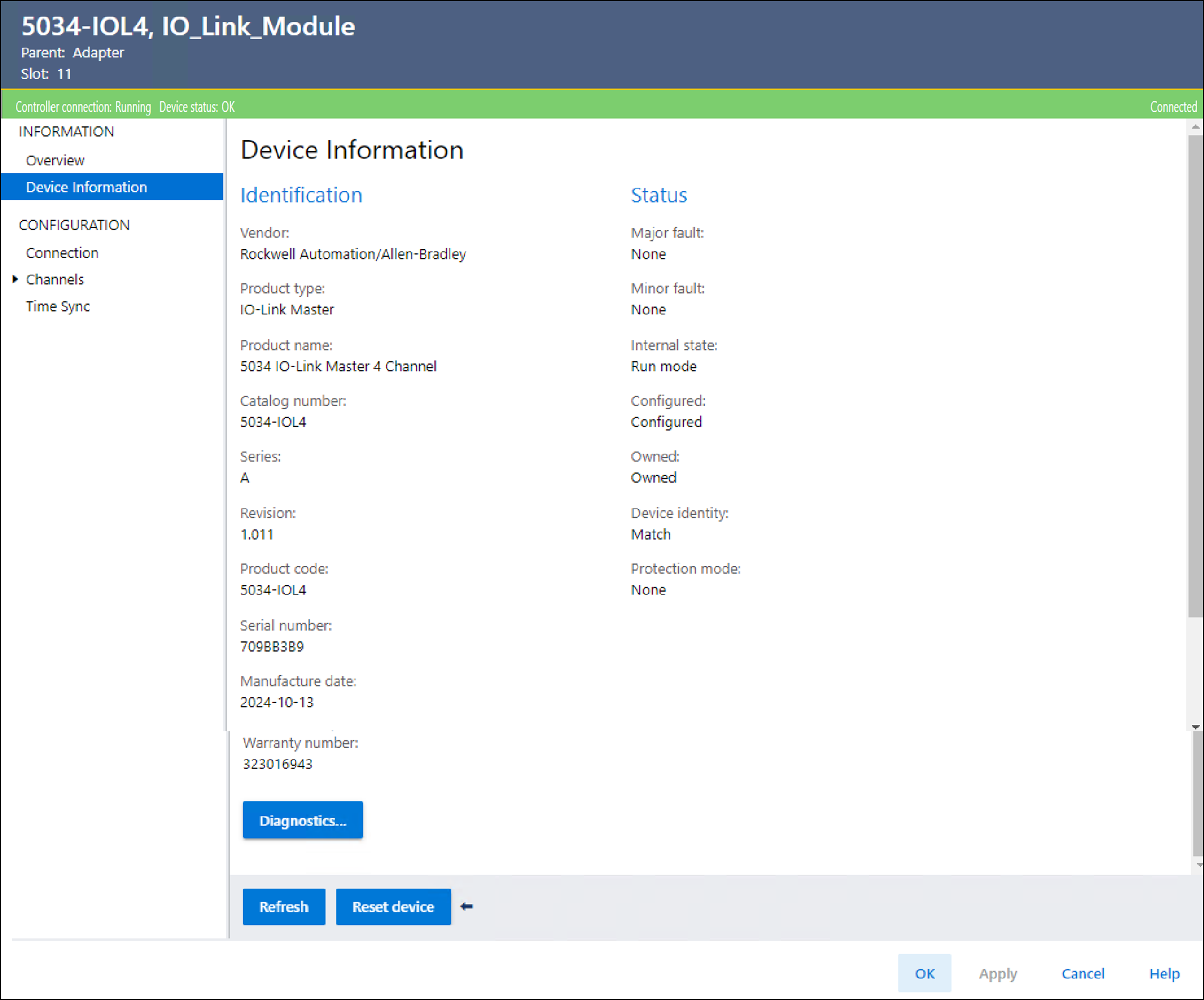 Utilisez la vue Device Information (Informations sur le dispositif) pour afficher les informations sur le dispositif et son état lorsque le dispositif est en ligne.