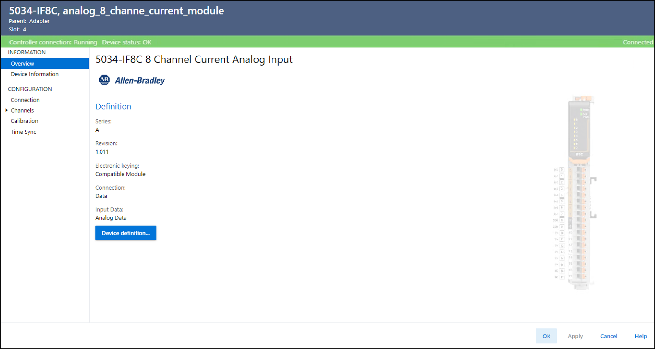 La vue Overview (Vue d’ensemble) permet d’afficher la définition d’un dispositif, notamment le type de dispositif, la révision, le détrompage électronique, la connexion et d’autres valeurs spécifiques au dispositif.
