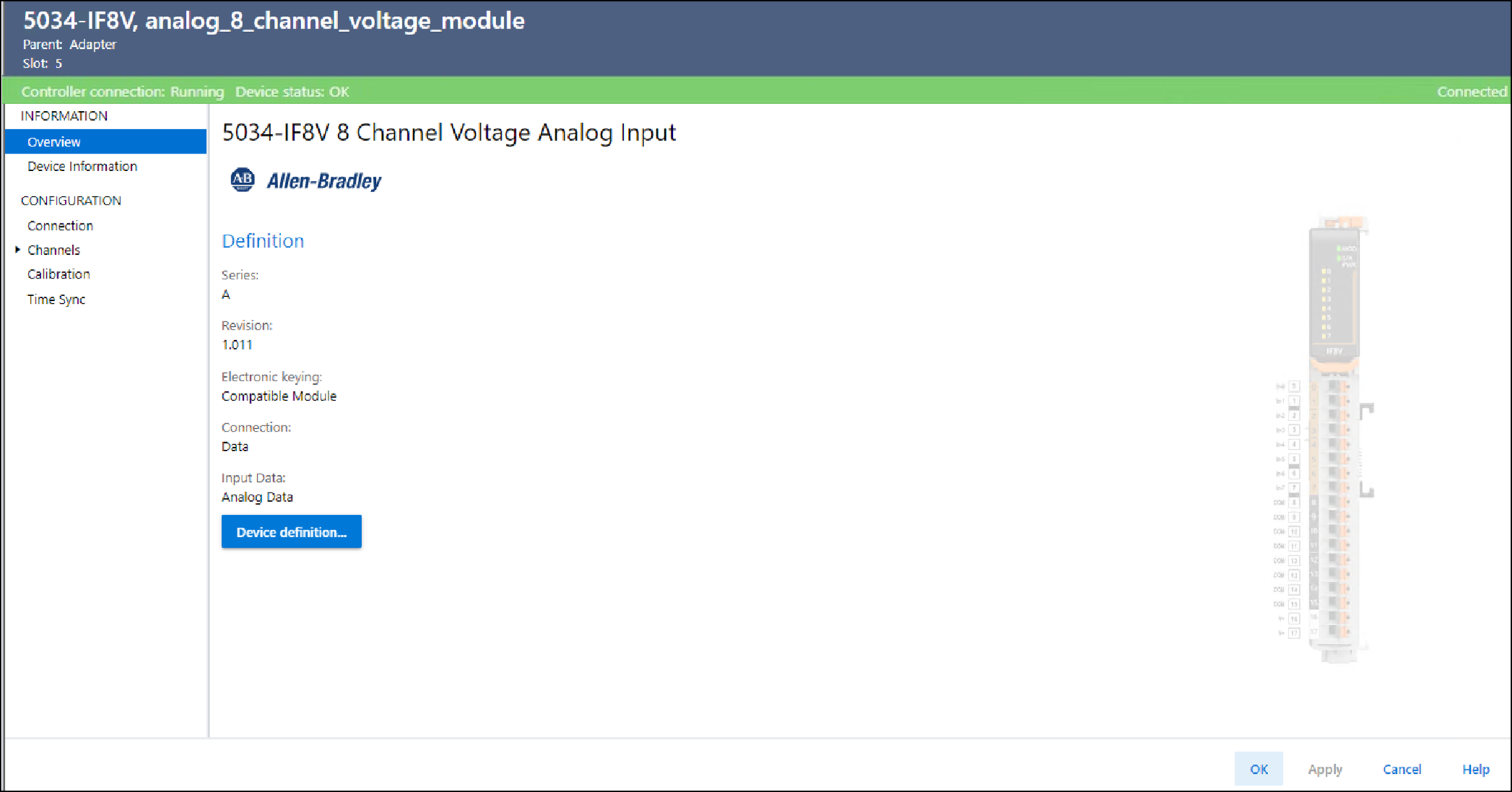 La vue Overview (Vue d’ensemble) permet d’afficher la définition d’un dispositif, notamment le type de dispositif, la révision, le détrompage électronique, la connexion et d’autres valeurs spécifiques au dispositif.