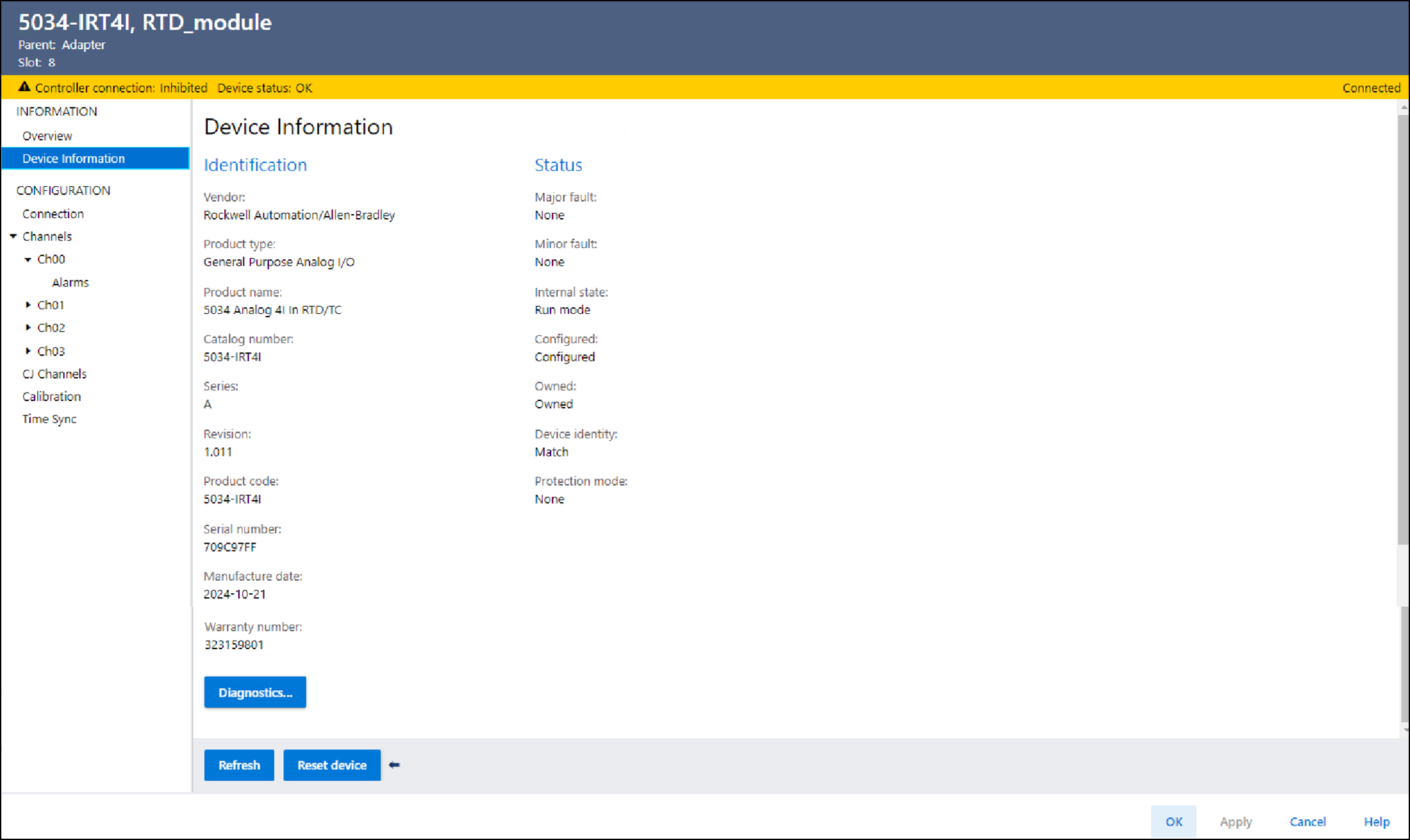 Exemple de vue Device Diagnostics (Diagnostics du dispositif)