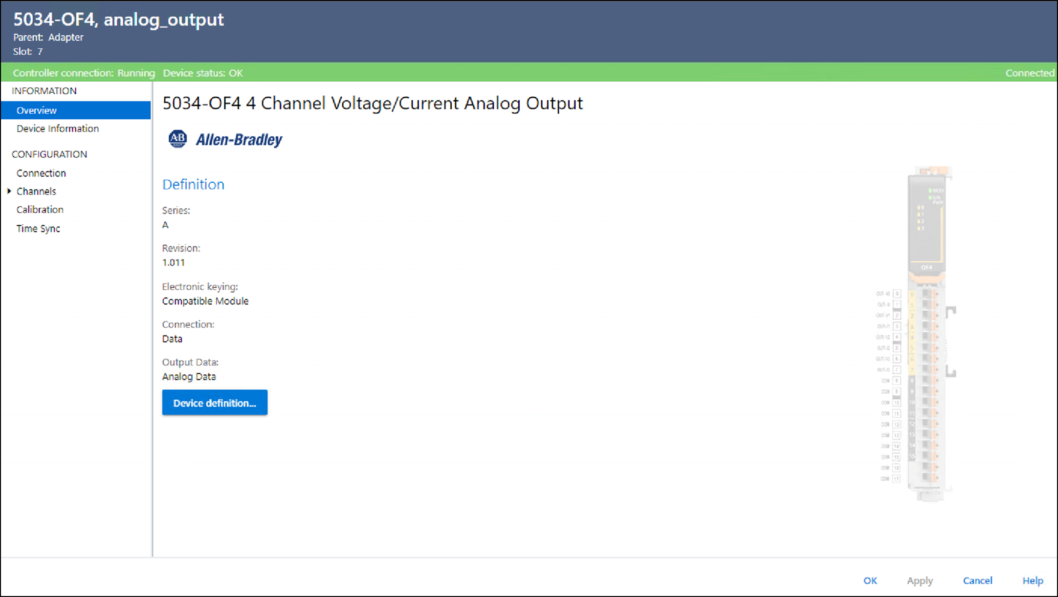 La vue Overview (Vue d’ensemble) permet d’afficher la définition d’un dispositif, notamment le type de dispositif, la révision, le détrompage électronique, la connexion et d’autres valeurs spécifiques au dispositif.