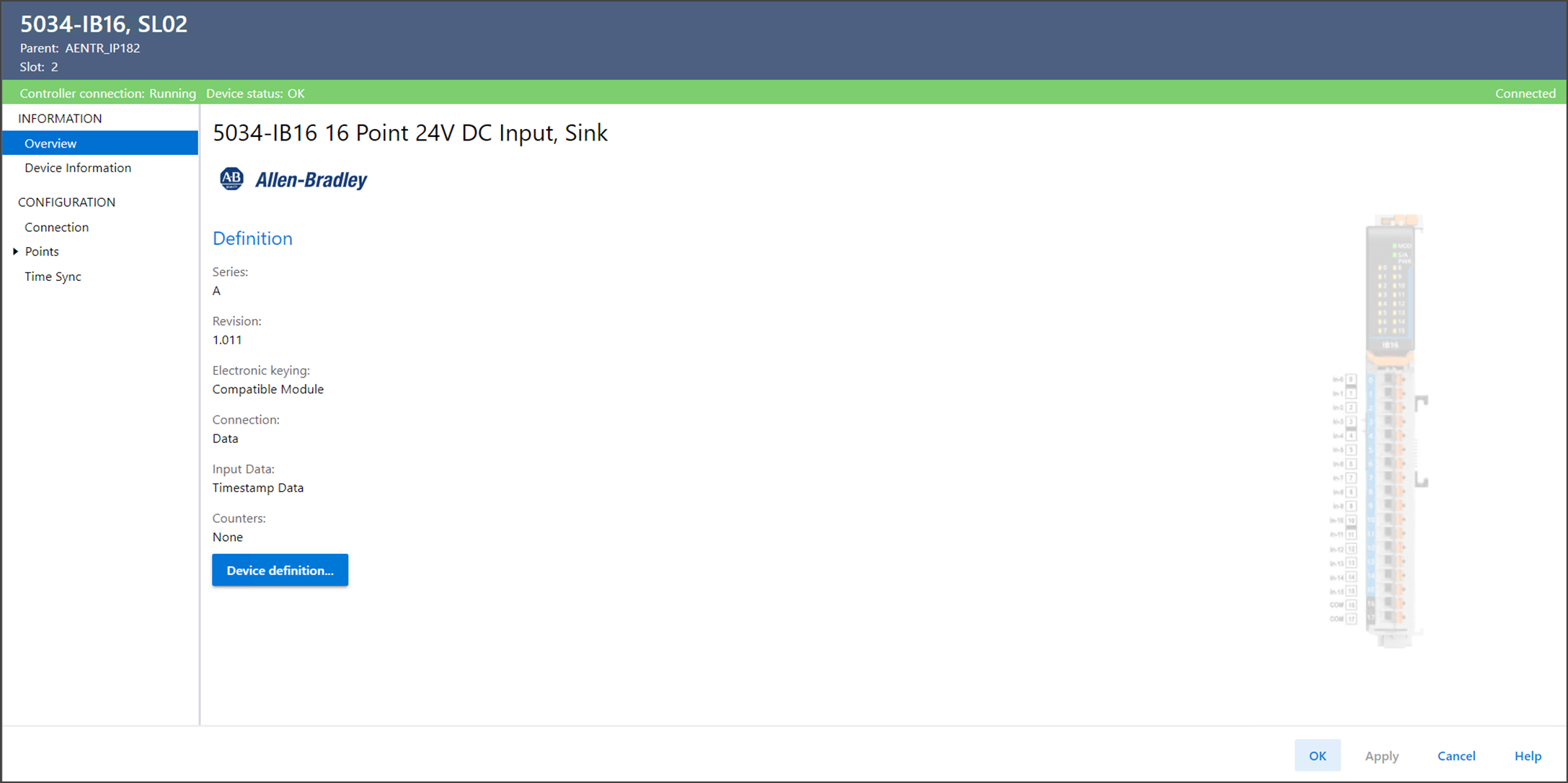 La vue Overview (Vue d’ensemble) permet d’afficher la définition d’un dispositif, notamment le type de dispositif, la révision, le détrompage électronique, la connexion et d’autres valeurs spécifiques au dispositif.