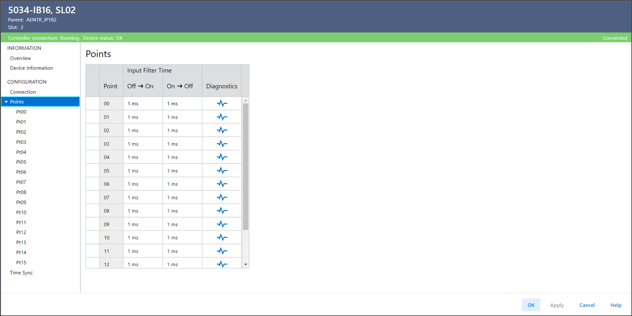 Pour afficher les diagnostics Ptxx, sélectionnez Diagnostics dans la vue Points ou Ptxx.