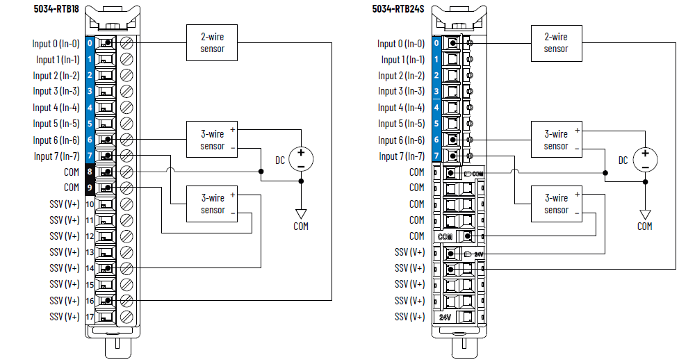 COM/V+コネクションを追加するには、5034-RTB24Sを使用するか、5034-MBPTMまたは5034-MBPTMXTをモジュールの横に取付けます。